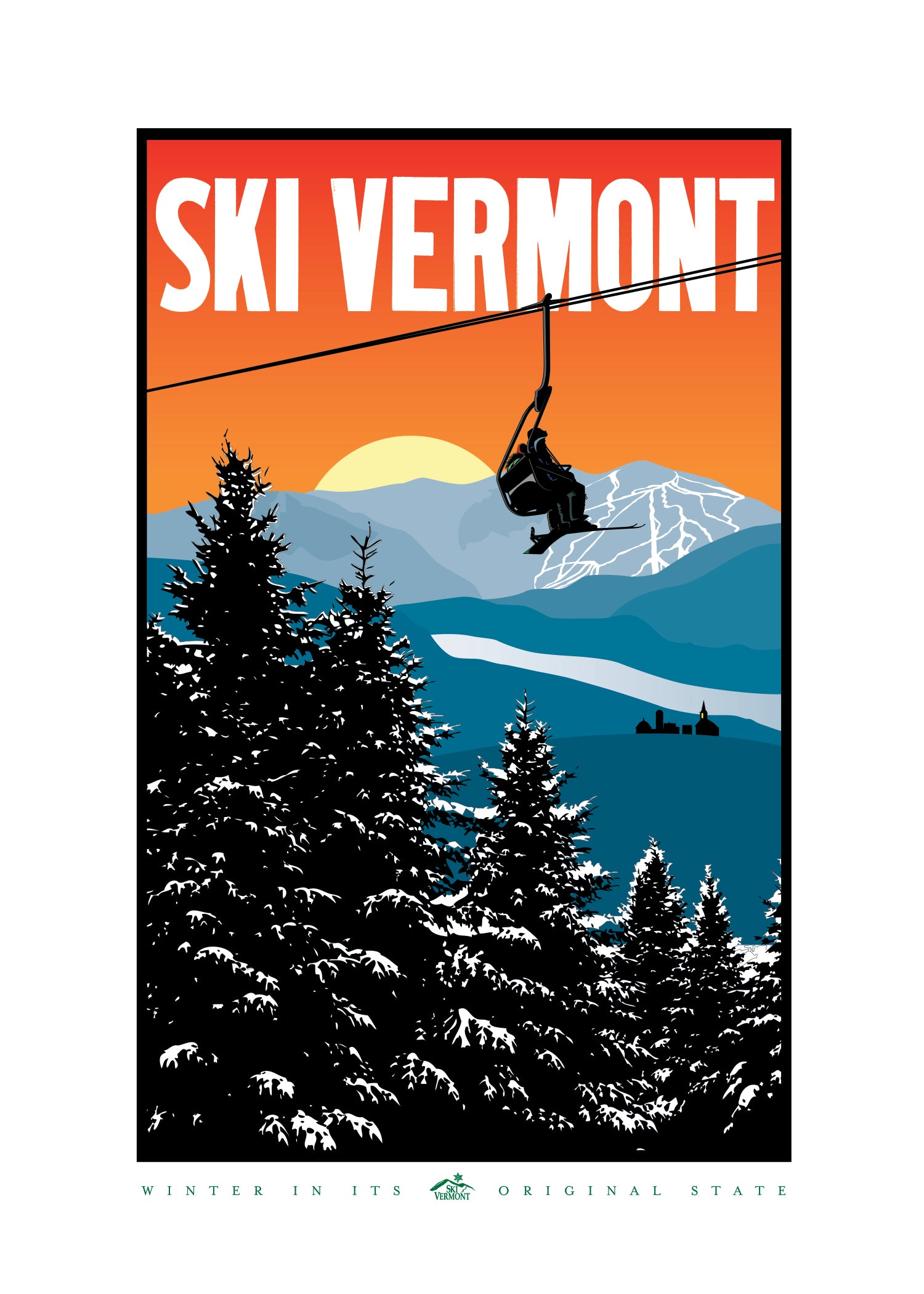 There’s nothing like a chairlift ride at sunset—and this Ski Vermont poster captures that perfect moment. With warm skies, snow-covered peaks, and evergreens below, it’s a scene every skier and rider knows and loves. Whether you're counting down to first chair or reminiscing about your last run, this print brings those winter feels home.
