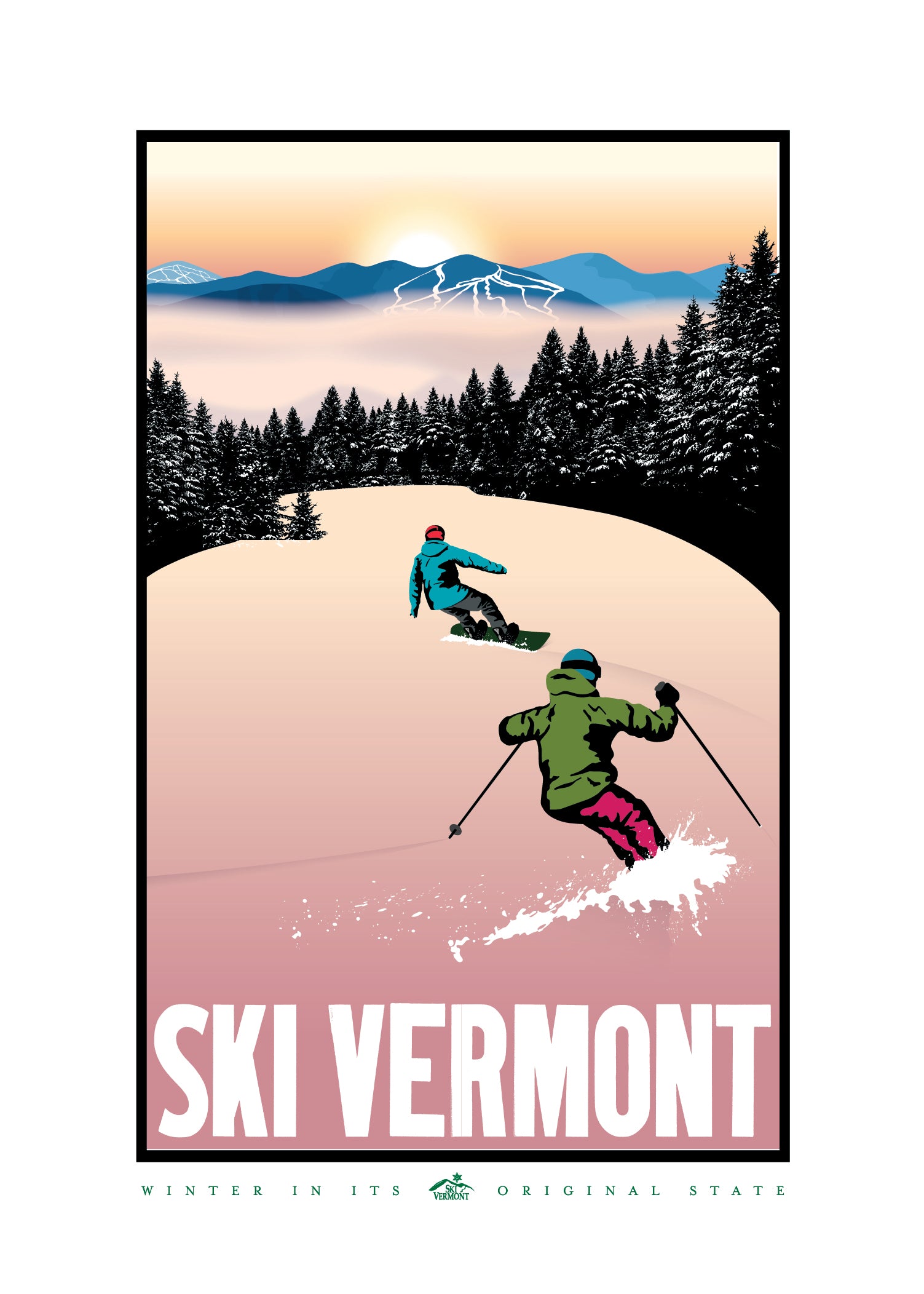 Catch the sunrise and the stoke with this vibrant Ski Vermont poster. A skier and snowboarder cruise down a wide-open trail with mountain views, fresh snow, and a dreamy sunrise lighting up the sky. With soft colors and bold action, it’s the perfect piece for anyone who lives for early tracks and big Vermont vistas.