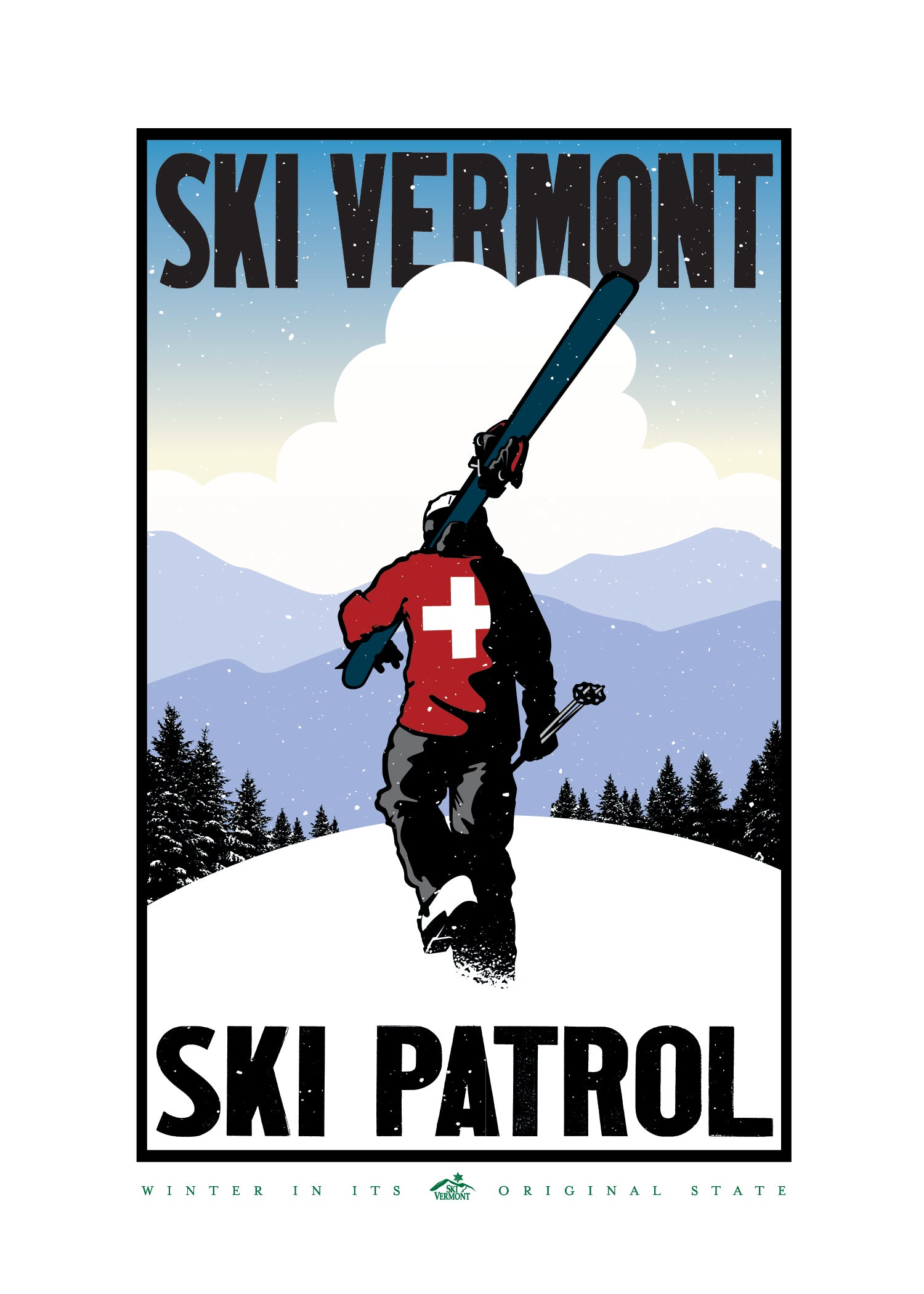 Part of our Industry Tribute Series, this Ski Vermont poster honors the brave and skilled ski patrollers who keep the slopes safe. Featuring a patroller with skis slung over their shoulder, hiking through snow with mountains behind them, it’s a strong visual salute to the folks first on the hill and last to leave. A bold, respectful addition to any skier’s wall—and a reminder of the heart behind every ski day.
